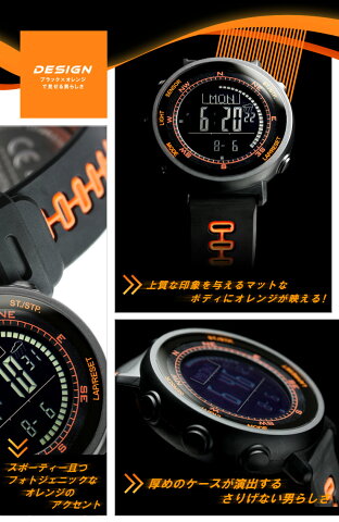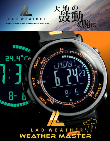 メーカー希望小売価格はメーカーサイトに基づいて掲載していますLAD WEATHER ラドウェザー 腕時計 メンズ スポーツウォッチ アウトドア 限定モデル lad002カラー01.オレンジ:ブラック×オレンジ(文字盤・ベルト)02.グリーン:ブラック×ライトグリーン(文字盤・ベルト)03.ホワイト:ブラック×ホワイト(文字盤・ベルト)04.ライトレッド:ブラック×レッド(文字盤・ベルト)05.ライトブルー:ブラック×ブルー(文字盤・ベルト)仕様駆動方式電池式表示方式デジタル表示(反転液晶)裏蓋ネジ留め式防水1気圧防水バックル穴留め式機能■スイス製センサー搭載■天気予測・気圧の変化を元に、今後の天気を4つのアイコン(晴れ/曇り/晴れ時々曇り/雨)で予測■高度計・現在地の高度の計測・現在地の高度の修正・過去23時間の高度履歴をグラフで表示・履歴の確認(履歴時間とその時の高度の確認)■気圧計・現在地の気圧の表示・現在地の気圧の修正・過去23時間の海面気圧をグラフで表示・履歴の確認(履歴時間とその時の海面気圧の確認)・海面気圧の修正■デジタルコンパス・方位の表示・方角の表示・キャリブレーション(計測器具の偏りを修正する)、 ディクリネーション(磁気偏差を修正する)で コンパスの調整・修正が可能。