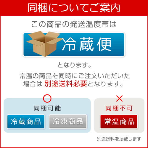 ※こちらの商品 + 常温の商品 =同梱不可、常温便の送料別途必要 ※こちらの商品 + 冷蔵の商品 同梱OK、冷蔵便で出荷 ※こちらの商品 + 冷凍商品 = 同梱OK、冷凍便で出荷 ■21,600円を超えるごとに1個口分送料サービス致します。